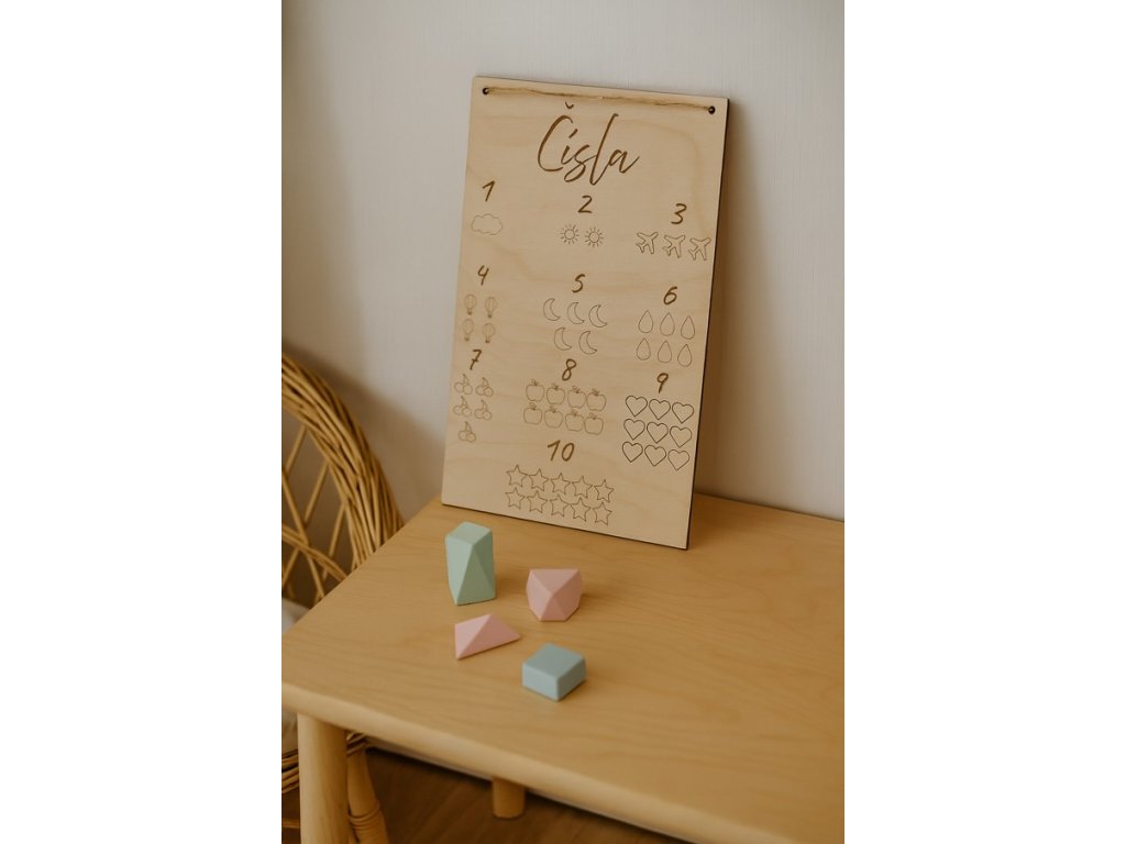 Naše dřevěná cedulka s čísly je ideální učební pomůckou pro děti, které se učí rozpoznávat číslice a chápat jejich význam. Pod každým číslem od 1 do 10 je odpovídající počet jednoduchých symbolů, což napomáhá vizuálnímu učení a logickému myšlení.
