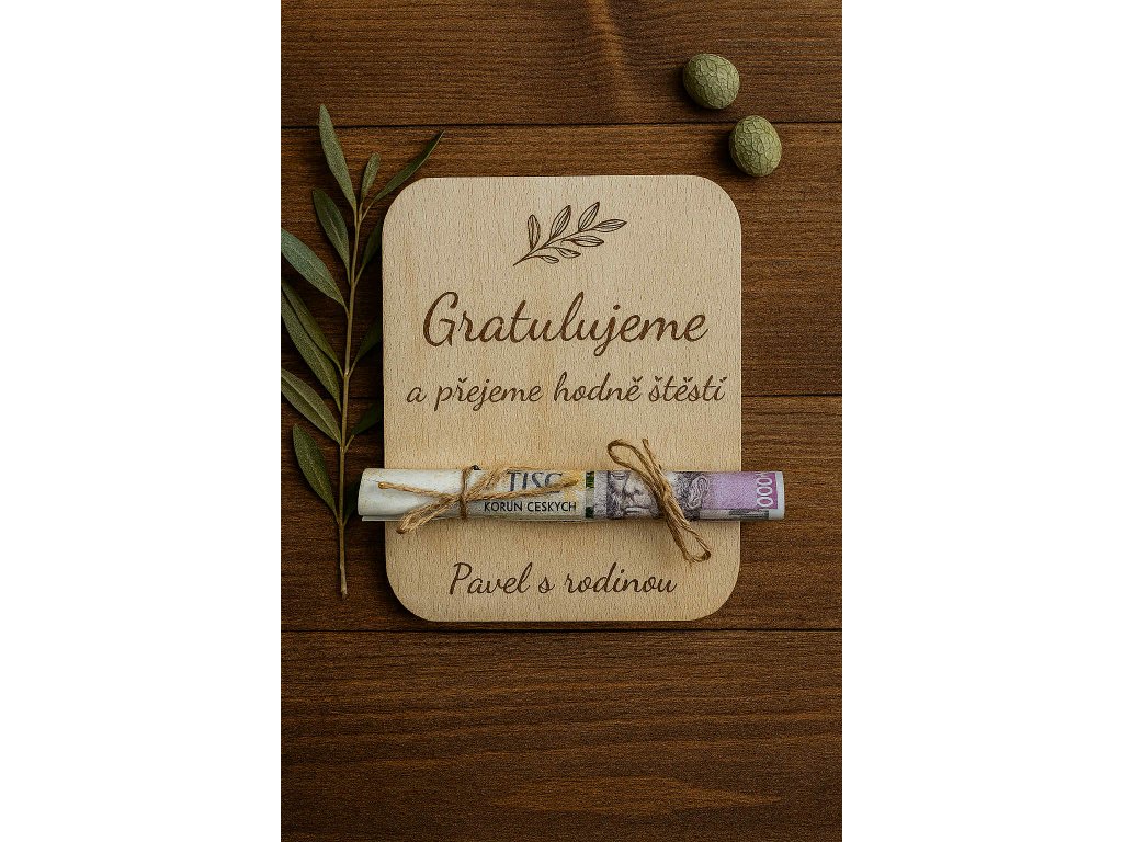 Na kvalitní bukové překližce o síle 3 mm je jemně vygravírovaný text „Gratulujeme a přejeme hodně štěstí“. Stačí jen připevnit peníze provázkem (který je součástí balení) a máte dokonalé svatební přání i dárkovou kartu na peníze v jednom.