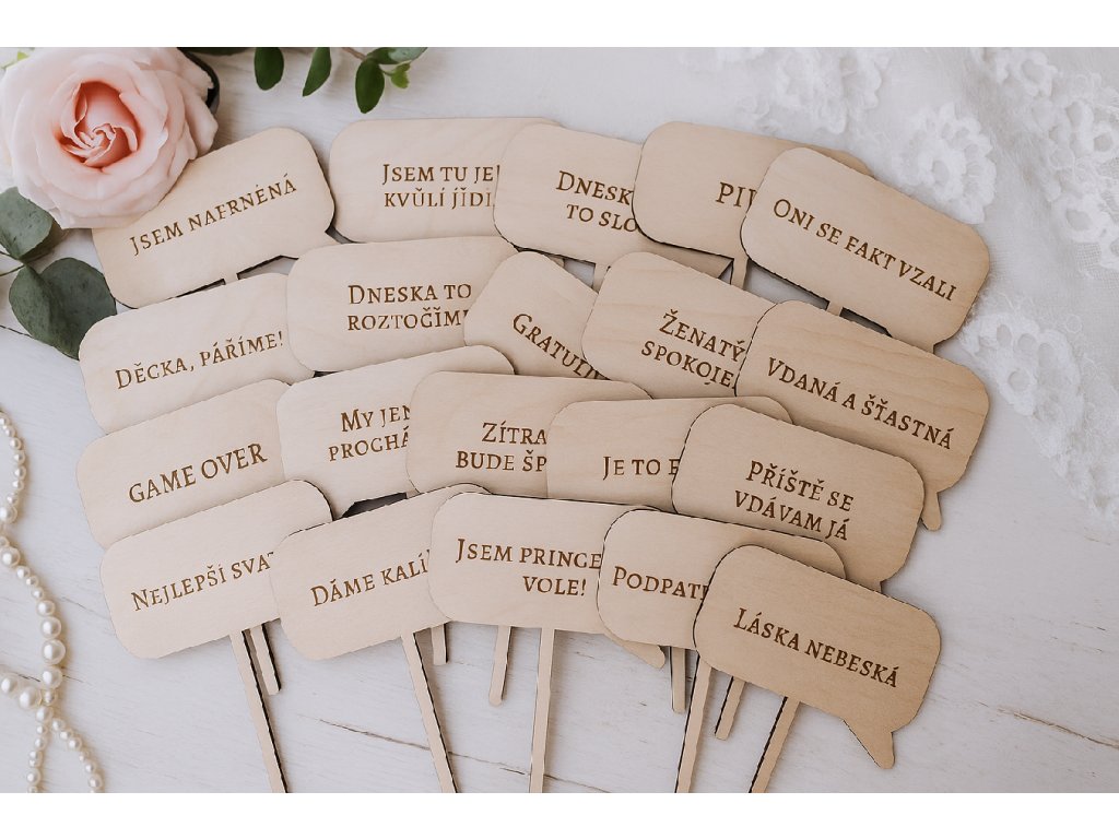 Vyrobené z kvalitní 3mm bukové překližky. Cedulky jsou lehké, odolné a skvěle se drží při focení. Díky kompaktnímu rozměru 14 × 10 cm se hodí pro skupinové fotky i selfie. Cena je za 1 kus, takže si jednoduše poskládáte vlastní sadu rekvizit do fotokoutku podle stylu vaší svatby.
