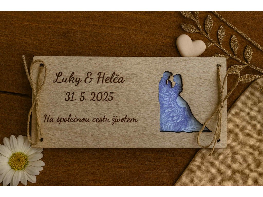 Obálka o rozměru 20 × 10 cm je vyrobená z kvalitní 3mm bukové překližky. Na přední straně jsou precizně vyřezané siluety ženicha a nevěsty, doplněné gravírovanými jmény budoucích novomanželů, datem svatby a krásným textem „Na společnou cestu životem“.
