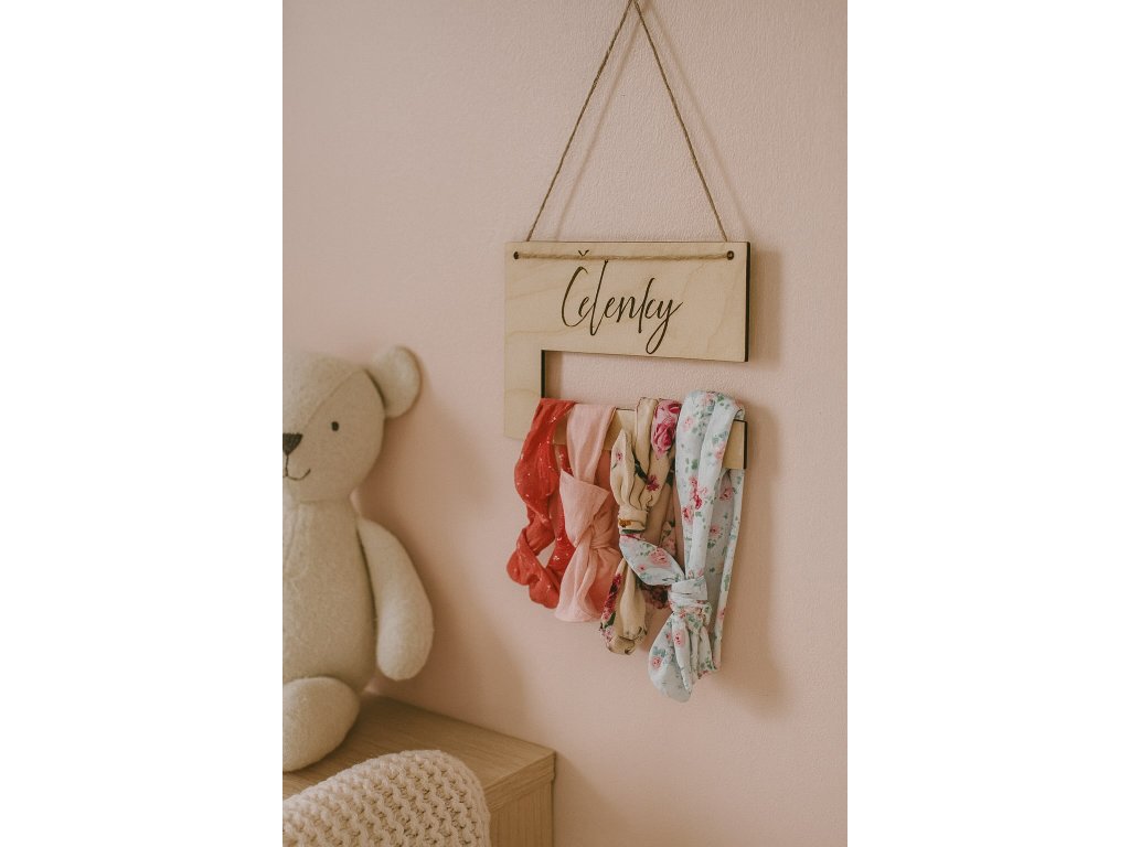 Tento dřevěný věšák na čelenky je nejen praktickým řešením, ale i krásnou dekorací do dětského pokojíčku.